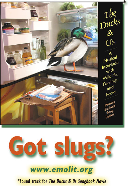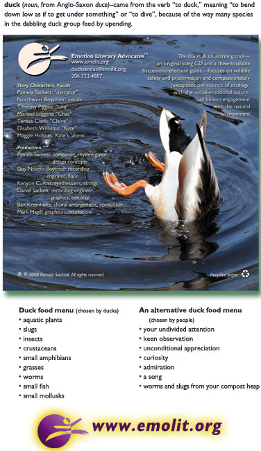 This playful image comes from The Ducks & Us song CD jacket, a musical interlude with wildlife, feelings and food, featuring the Northwest Boychoir and Emotion Literacy Advocates artists. Back side shows a duck in its natural habitat, a dictionary definition of duck, the duck's natural menu and what non-food offerings people can make to ducks.