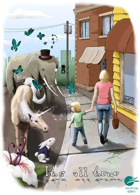 Part of the Emotion Literacy Advocates' meme project, this image was created by artist Nathan Gregory in consultation with ELA to illustrate a scene that includes both childhood and adult perceptions. Mutual inclusivity is a fundamental concept of emotion literacy. Though perceptions can be questionable and often change, the feelings that accompany those perceptions are valid and hungry for acceptance. Feelings and needs can be worlds apart when it comes to children and adult "realities" but they co-exist. No matter how diametrically opposed, they are all true.